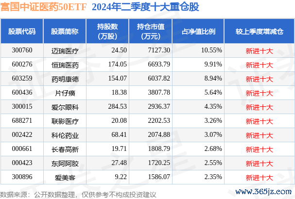 富国中证医药50ETF为指数型-股票基金,字据最新一期基金季报证实,该基金钞票建立:股票占净值比99.6%,无债券类钞票,现款占净值比0.5%。基金十大重仓股如下: