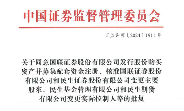 证监会官网发布《对于开心国联证券股份有限公司刊行股份购买资产并召募配套资金注册、核准国联证券股份有限公司和民生证券股份有限公司变更主要股东、民生基金料理有限公司和民生期货有限公司变更本体搁置东谈主等的批复》。